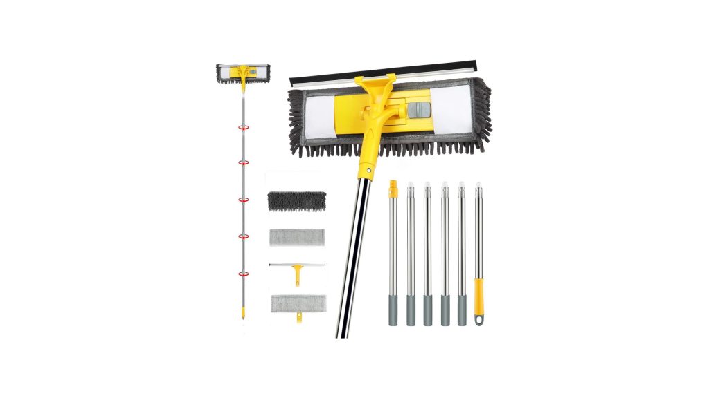 - The combination of a cleaning mop and a large squeegee on an extended pole allows for efficient cleaning of large surface areas.