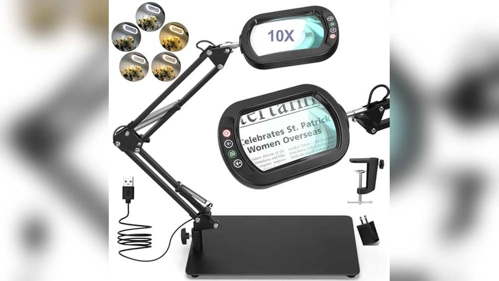 This TOMSOO magnifying glass offers clear 10X zoom for detailed work. Bright LED lights come in five colors and can dim smoothly. Its clamp and flexible gooseneck let you work hands-free with ease. Perfect for reading, crafting, painting, and other close tasks. The sturdy stand keeps it steady and easy to adjust. A helpful tool for hobbies and small projects.