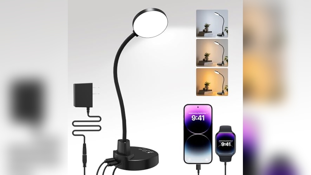 This desk lamp offers great light quality with three color options and five brightness levels. The flexible gooseneck makes it easy to adjust the light exactly where needed. USB charging ports on the base are very handy for charging phones or tablets. Timers help save energy by turning off the light automatically. The lamp’s design fits well on any desk or bedside table. Eye-friendly light reduces strain during long reading or work sessions. Controls are simple and easy to use, even for beginners. Overall, it’s a practical and useful lamp for home or office.